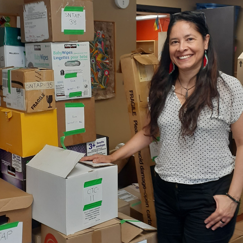 Which provides free-of-charge fabric and supplies to other non-profits and educational institutions. Recently we contributed fabric to the Connections Community Service Society (CCSS) in support of their Indigenous youth textile program. CCSS aims to share Indigenous teachings and culture with families. Our donation was utilized to create Ribbon Skirts, Button Blankets, and Button Drum Bags. After Hazel Trembath School in Port Coquitlam was tragically affected by fire earlier in 2023, we provided fabric that was used to establish a temporary classroom for Kindergarteners. In the aftermath of the incident, the school community was temporarily moved to an older building, and our fabric played a role in enhancing the learning environment in this temporary space.(Image: Alexandra of East Vancouver Co Dev, standing beside some of the boxes packed to go to The Cuban Public Employees Union and the Education, Sports and Cultural Workers Union of Cuba)